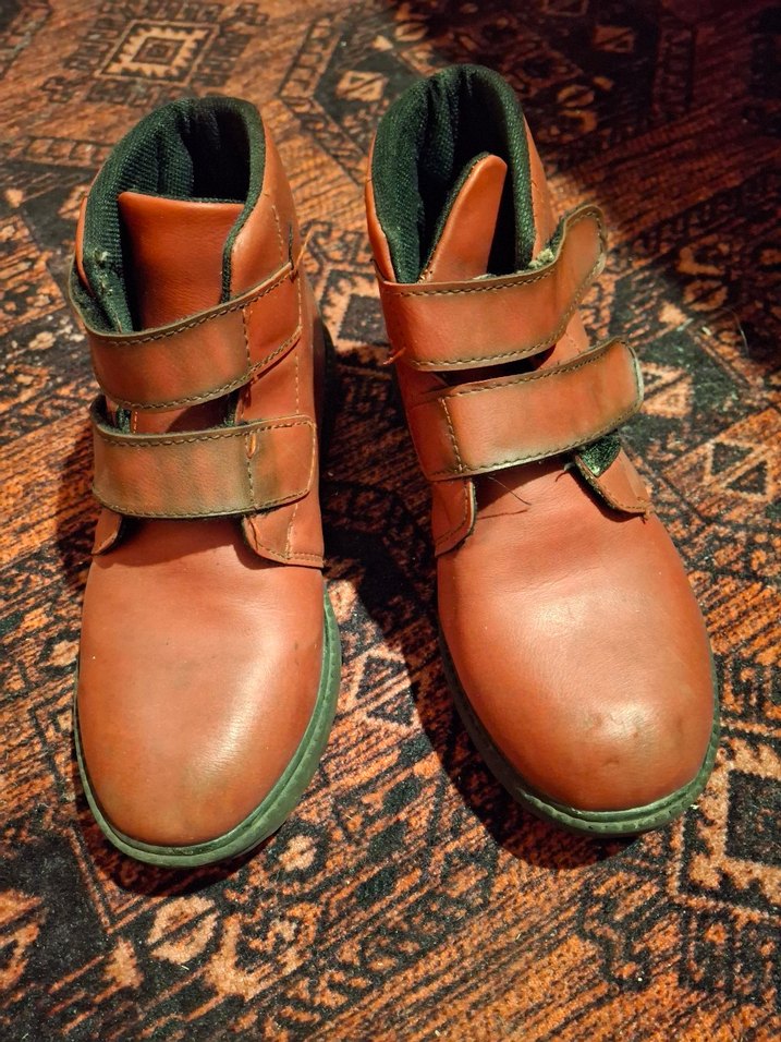 Tokalı kahverengi deri erkek çocuk botları, desen içermez. Rahat astarlı, sağlam yapıda ve counterculture tarzında. yeni gibidir