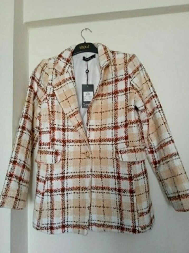 Bej kareli, düğmeli kadın blazer. Normal kesim, uzun kollu ve midi boyda. Yumuşak sentetik kumaştan, günlük rahat tarz için uygun.
