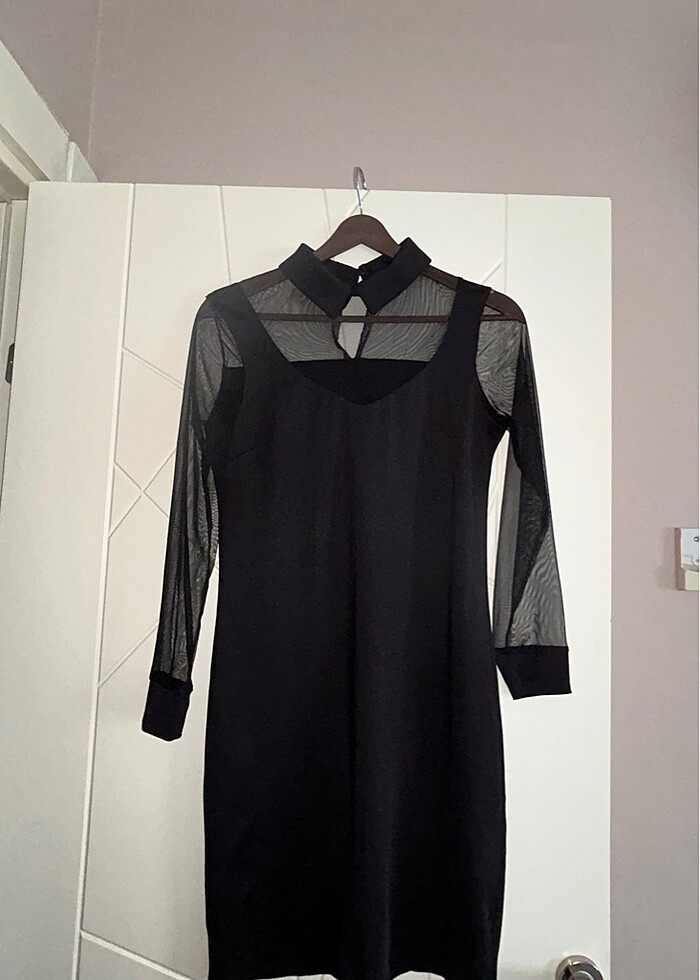 Bayan siyah elbise, 1-2 defa giyilmiş, esnek kumaş, 40-42 bedene uygundur, çok şık, iki kol arası 44cm, uzunluğu 86 cm.