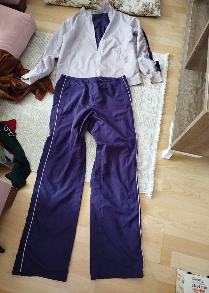 Lila ve mor renginde esofman takımı markadır sorunsuzdur beden öğretmenlerine veya spor yapanlara güzel giden bir modeldir pamukludur yagmurluk tarzında dış kumasa sahiptir xl beden takım halinde satıyorum