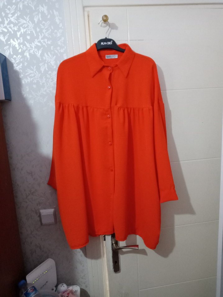 Bol kesim, turuncu gömlek, yakalı ve düğmeli öne sahiptir. Uzun kollu gündelik sokak tarzına uygundur. geniş kesim bayan gömlek 48.50.52 bedene kadar olur std beden ama kalıbı geniş