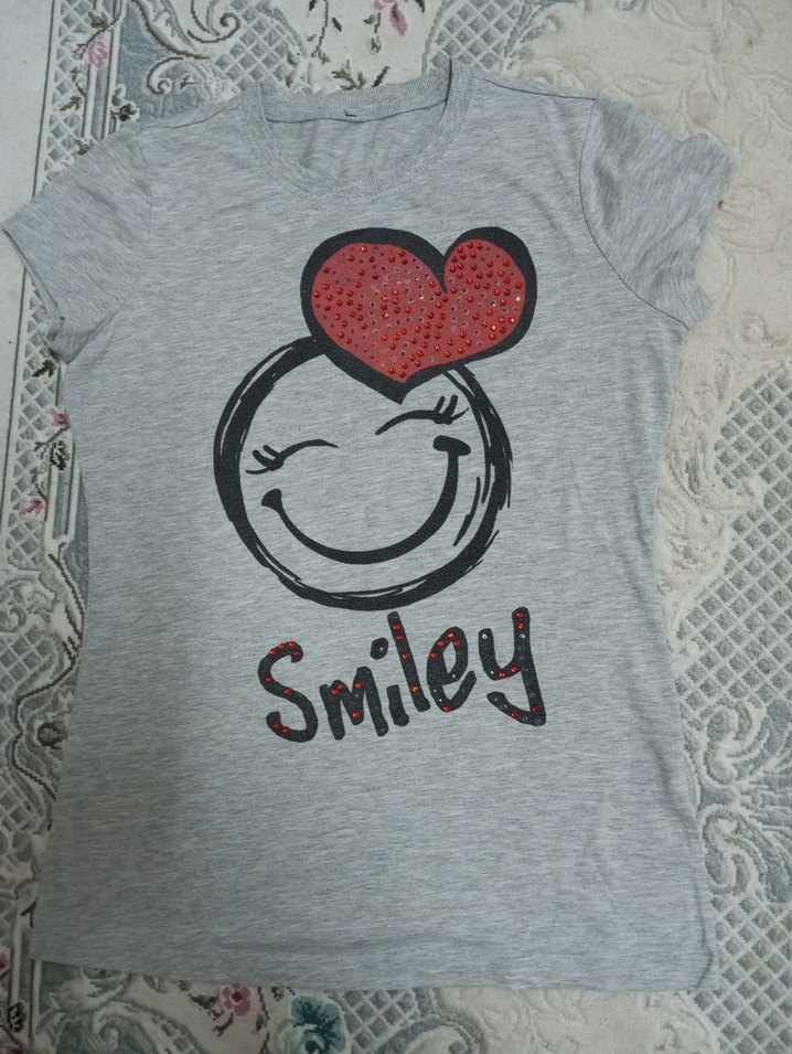 Gri renkli, kısa kollu, fitted kesim tişörtü. Önünde kırmızı payetli smiley baskı bulunur. Yumuşak sentetik kumaştan üretilmiştir.