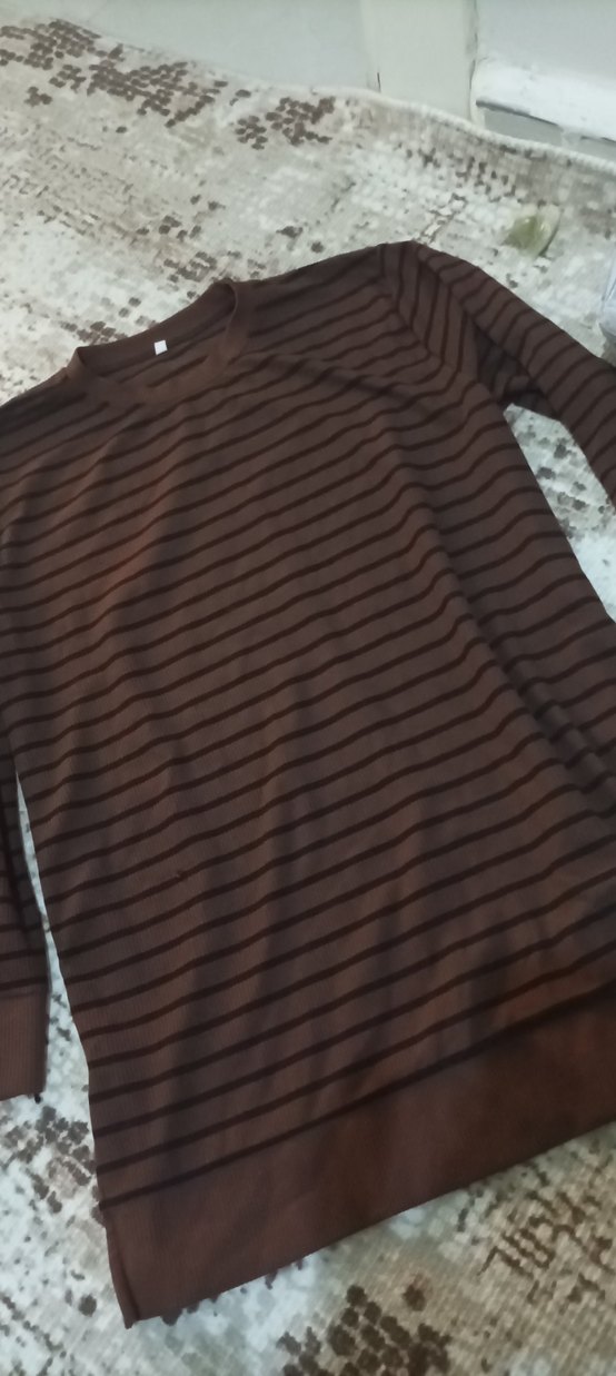 kadın in uzun kollu, bisiklet yaka ve bol kesim. Örgü dokulu, koyu kahverengi çizgili, yumuşak sentetik kumaştan, günlük rahat sokak stili için uygun.