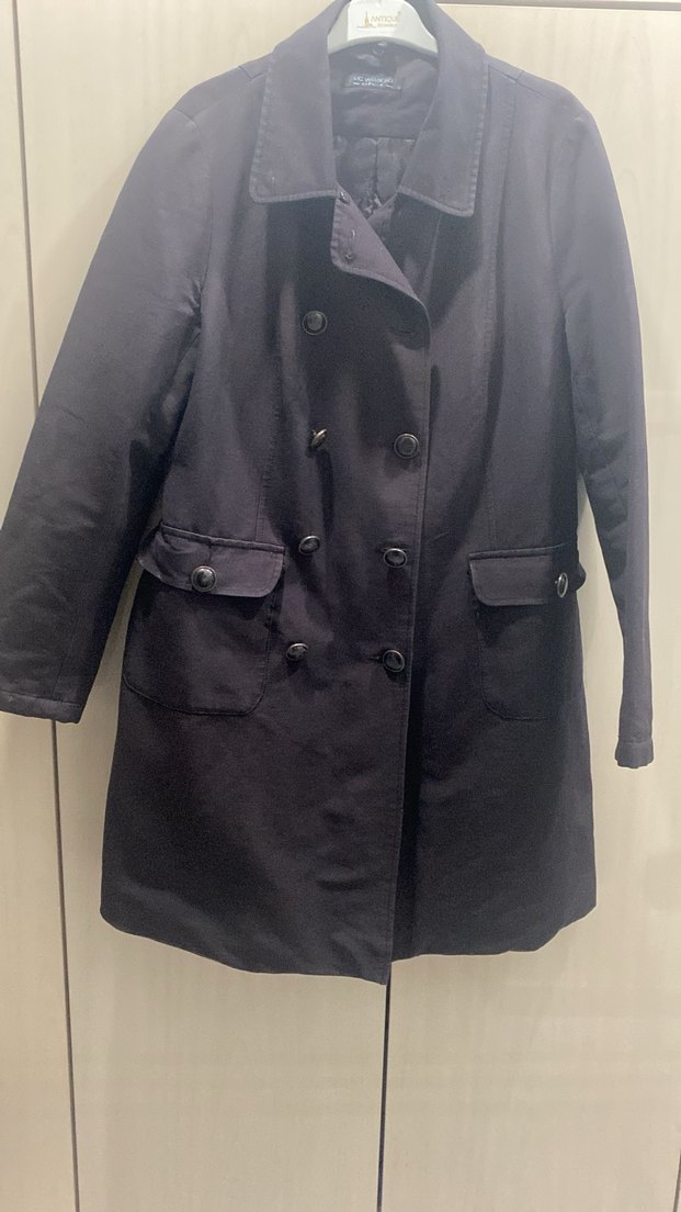Kadın kahverengi düğmeli midi trençkot, kesik yaka ve uzun kollu. Ofis için uygun, normcore tarzında, normal kesim ve sentetik kumaştan.