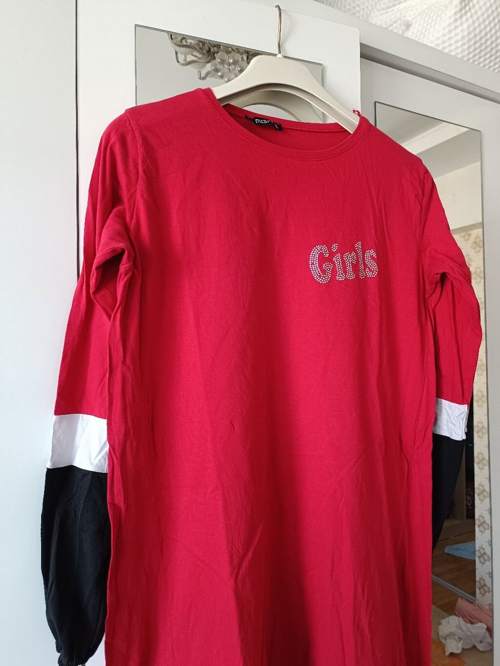 Pamuklu, kırmızı renkli uzun kollu tişört, bol kesim ve yuvarlak yaka ile. Parlak 'Girls' baskısı ve düğme detayları bulunur.