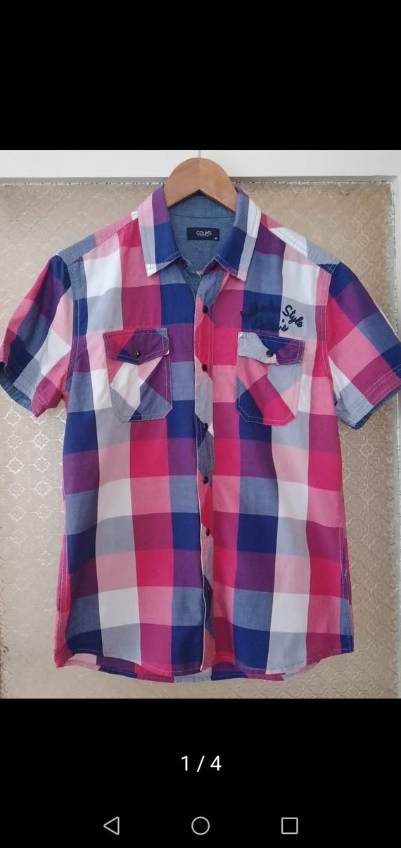 Bayan kısa kollu, yakalı ve düğmeli gömlek. Pastel pembe, mavi ve beyaz kareli desende, normal kesim kumaştan üretilmiştir.