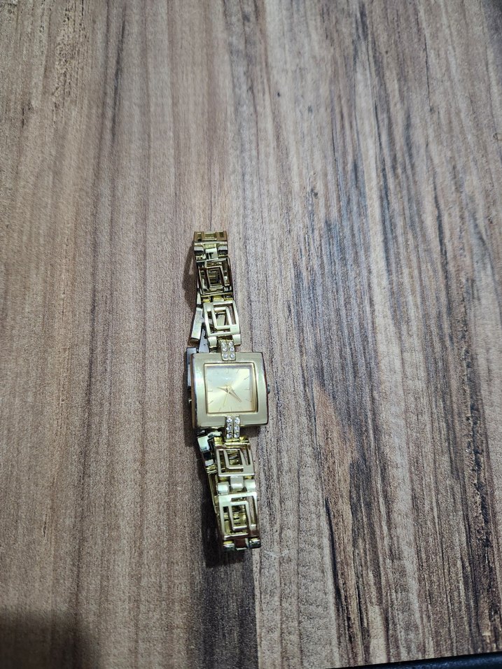 Zincir detaylı bileziğe sahip parlak altın kadın kol saati, vintage esintili modern klasik tasarıma sahiptir.⌚
