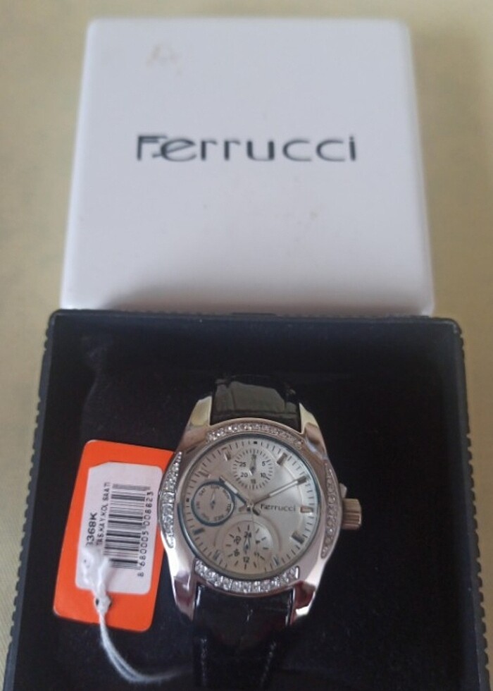 Ferrucci markalı siyah kordon, gümüş kadranlı ve kadranin alt ve üst kısmında taş detayları bulunmaktadır. Sıfır ürün, orjinal kutusunda gönderilecektir