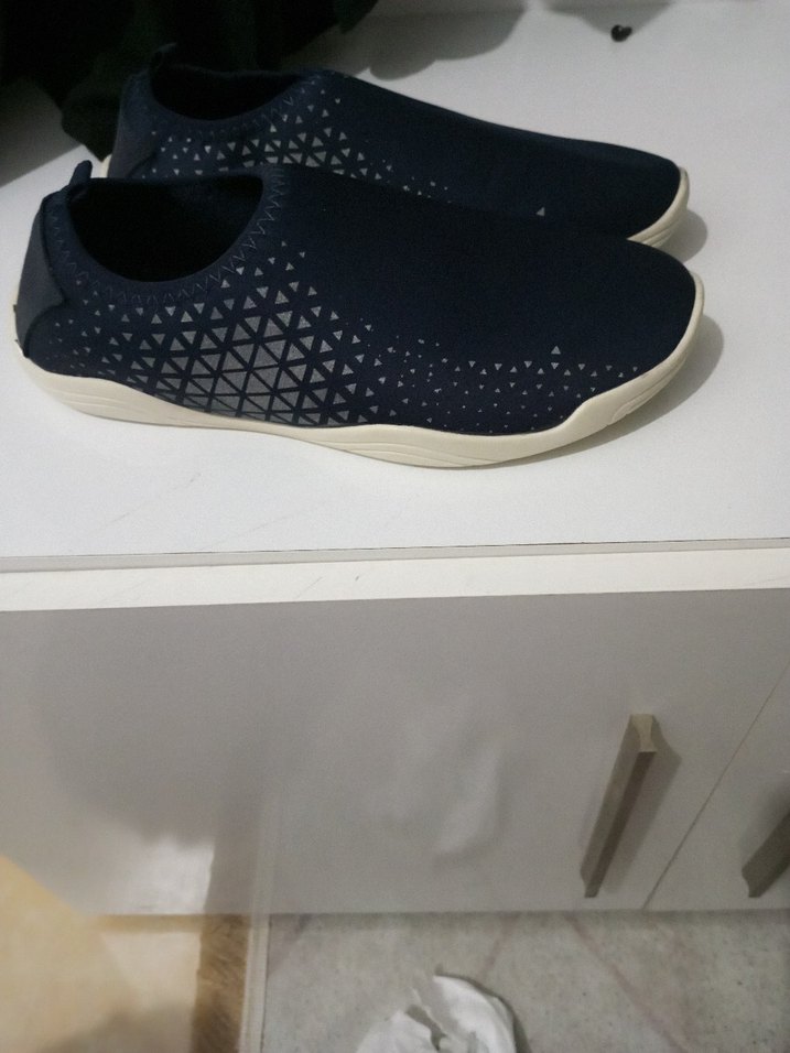 Kaymaz tabanlı, lacivert renk bayan su ayakkabısı, Velcro detaylı ve esnek kauçuk malzeme kullanılmıştır. Günlük sokak stili için uygundur.