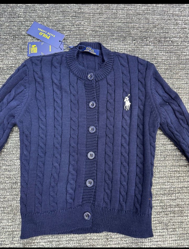 Uzun kollu, düğmeli önlü, örgü lacivert hırka. Rahat kesimi ve göğüste küçük logo detaylı, streetwear tarzına uygun.