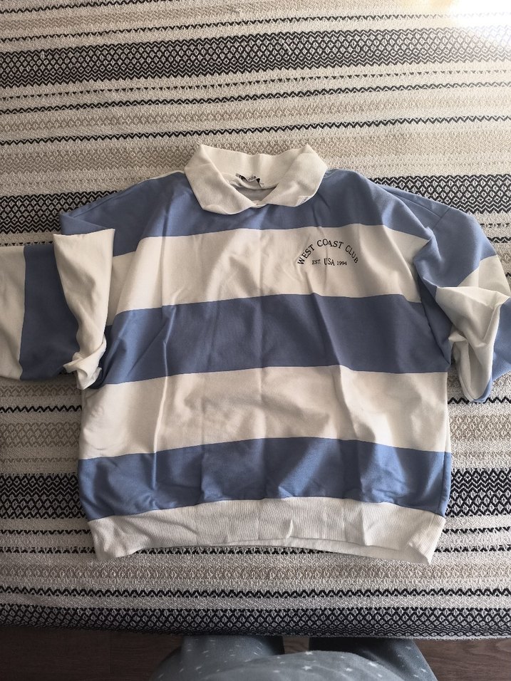 Uzun kollu, polo yaka ve bol kesim bayan sweatshirtü, pamuklu ve örme dokuludur. Pastel mavi-beyaz çizgili ve baskılı desene sahiptir.
