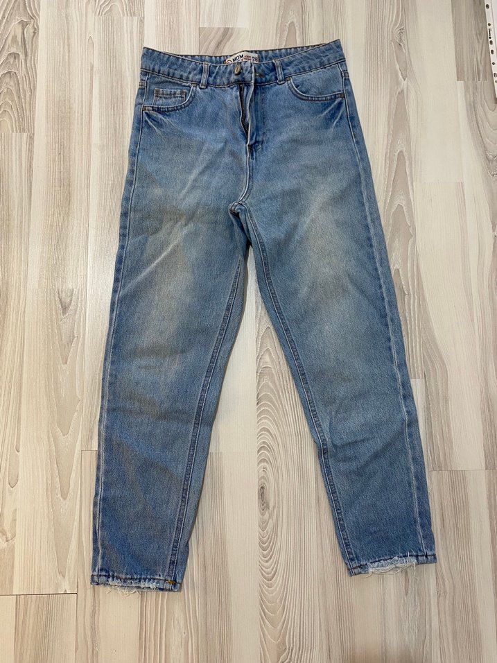 Pastel mavi tonlarında, midi boy ve salaş kesim bayan jean. Yumuşak denim kumaştan, gündelik kullanım için rahat ve şık. Ürün giyildi fakat deforme yoktur. Beden olmadığından satıyorum. #kot #mom #jean