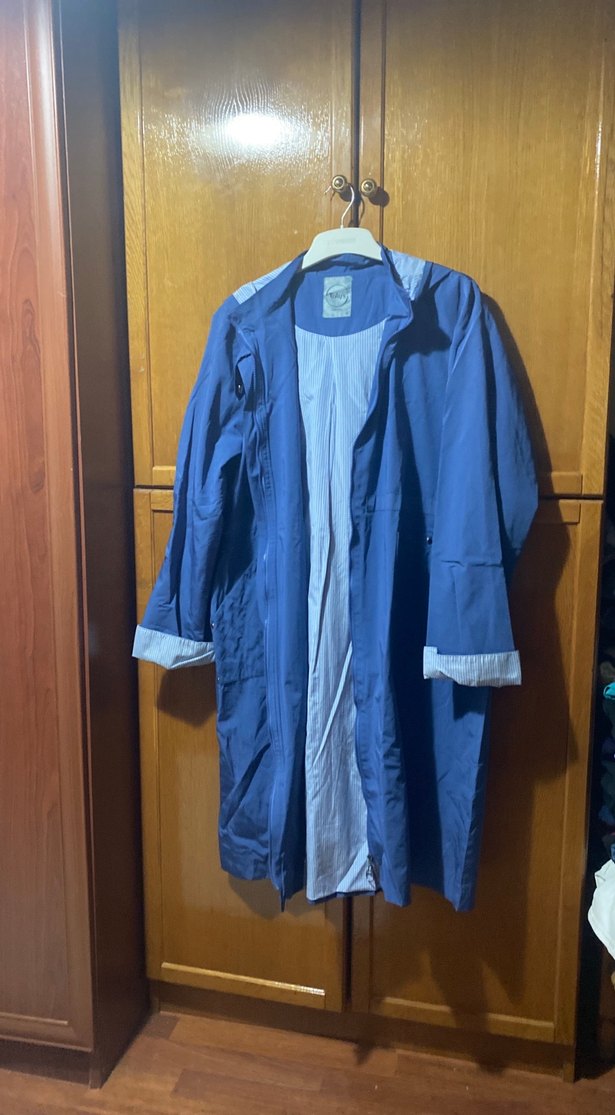 Bayan için mavi midi yağmurluk, düğmeli, uzun kollu ve keten kumaştan, minimalist sokak stiliyle günlük kullanıma uygun.tertemizdir