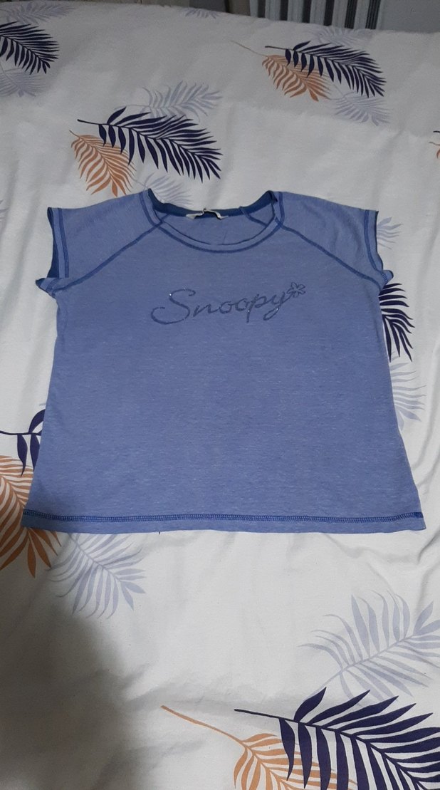 Pastel mavi renkli, kısa kollu, yuvarlak yaka ve bol kesim bayan tişörtü. "Snoopyte" baskılı ve payet detaylıdır, trend sokak stili için uygundur.