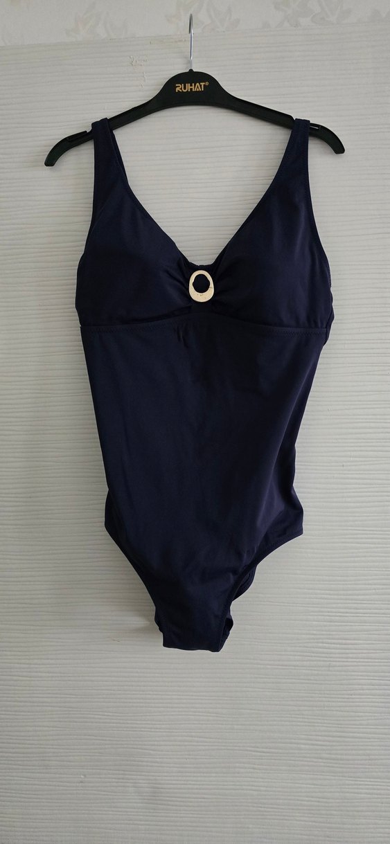 Kadınlar için lacivert renginde, tokalı ve ince askılı, vücuda oturan kesime sahip modern ve minimal tasarımlı midi boy mayo sadece arka kısmında hafif incelme var