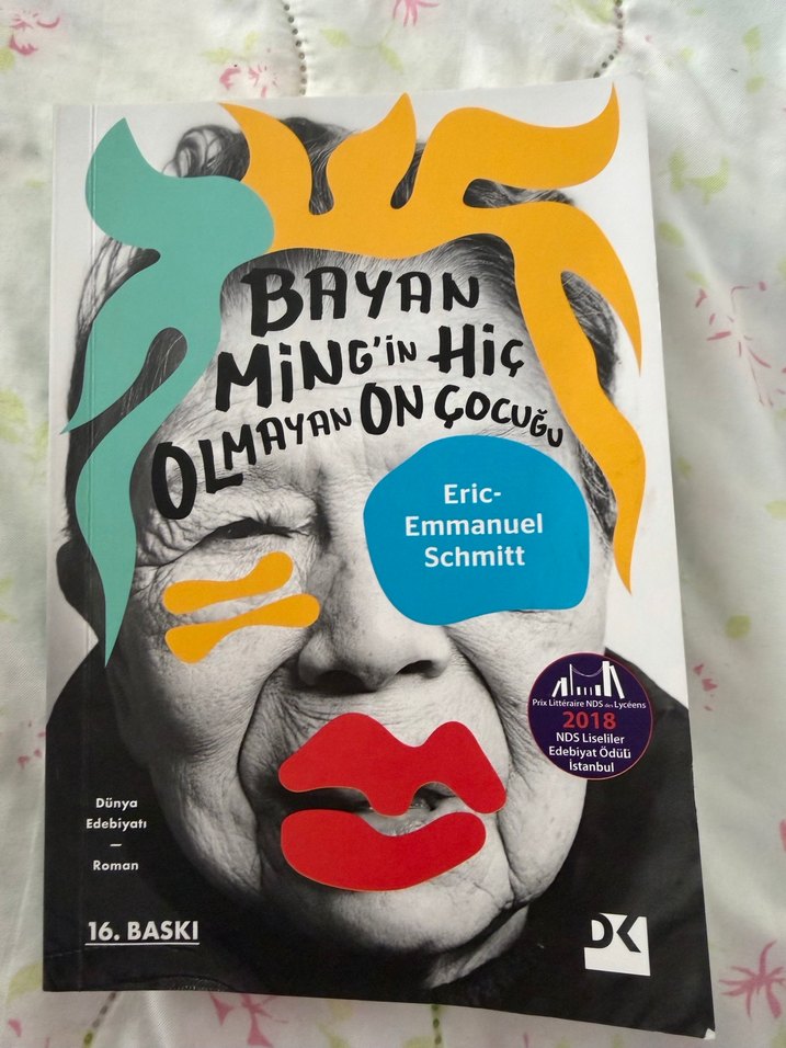 Eric-Emmanuel Schmitt'in 16. baskı eseri "Bayan Ming'in Hiç Olmayan On Çocuğu" mizahi bir romandır. Kapakta renkli soyut desenler ve siyah-beyaz portre yer alır.