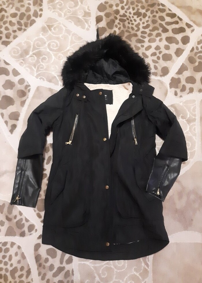 Çok az giydim.kol kısımları polar değil ince.kapşonun kürk kısmı çıkabiliyor.4 adet cebi var.paraşüt kumaş. Kol uçları deri ve bitiş yerleri durmaktan soyulmuş resimde var yoksa çok güzel duruyor