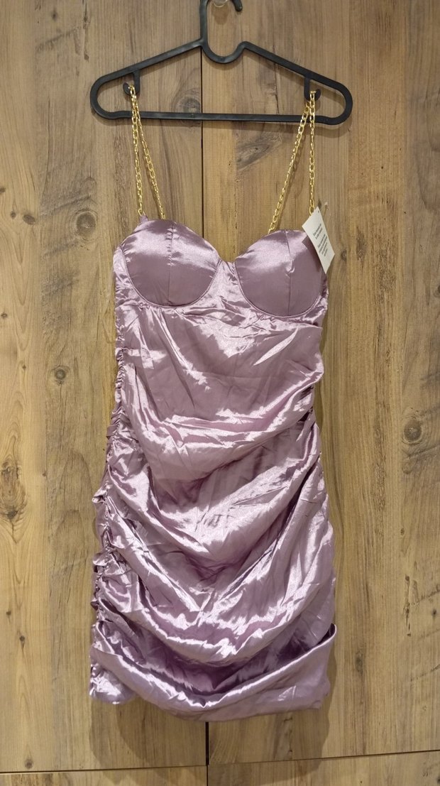 Parlak mor renkte, saten dokulu ve elastik yapılı, askıları zincirli yeni etiketli hiç giyilmedi