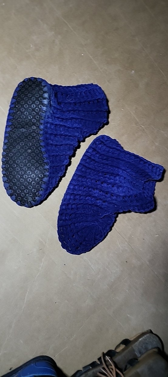 Mavi renkli, örgü bayan ev botları. Kaymaz tabanlı, rahat ve bohem tarzda, ev içinde kullanım için uygundur.