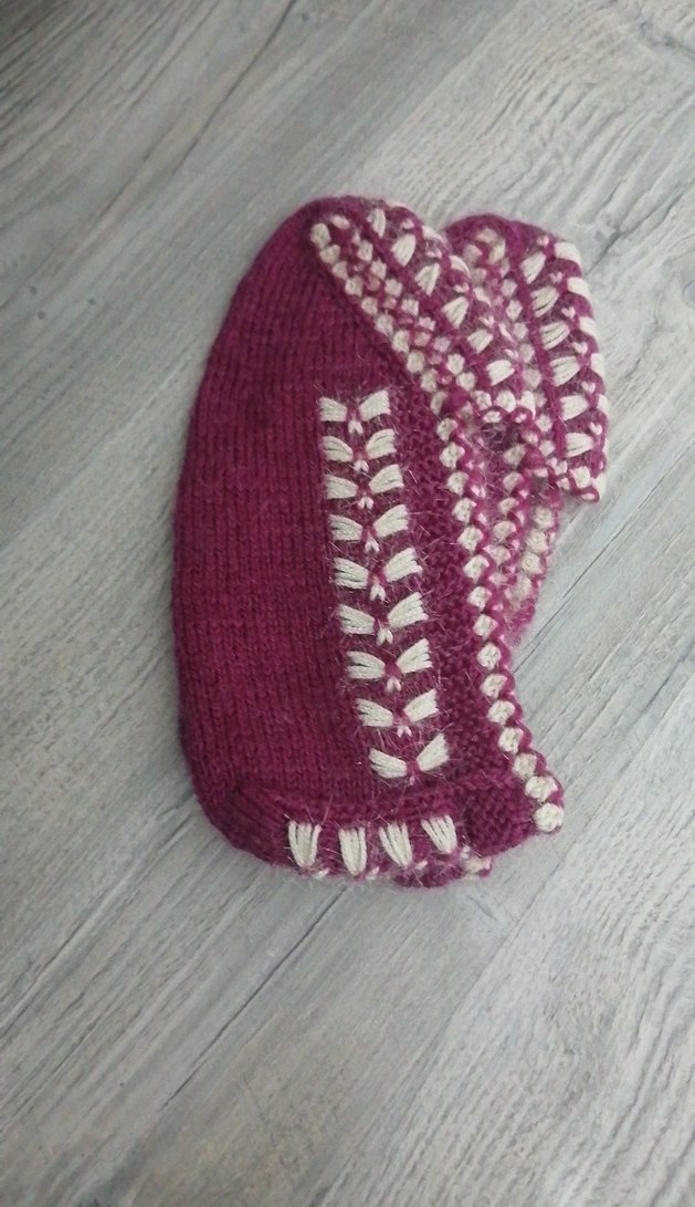 koyu pembe renkte,krem renk nakışlı örgü patik