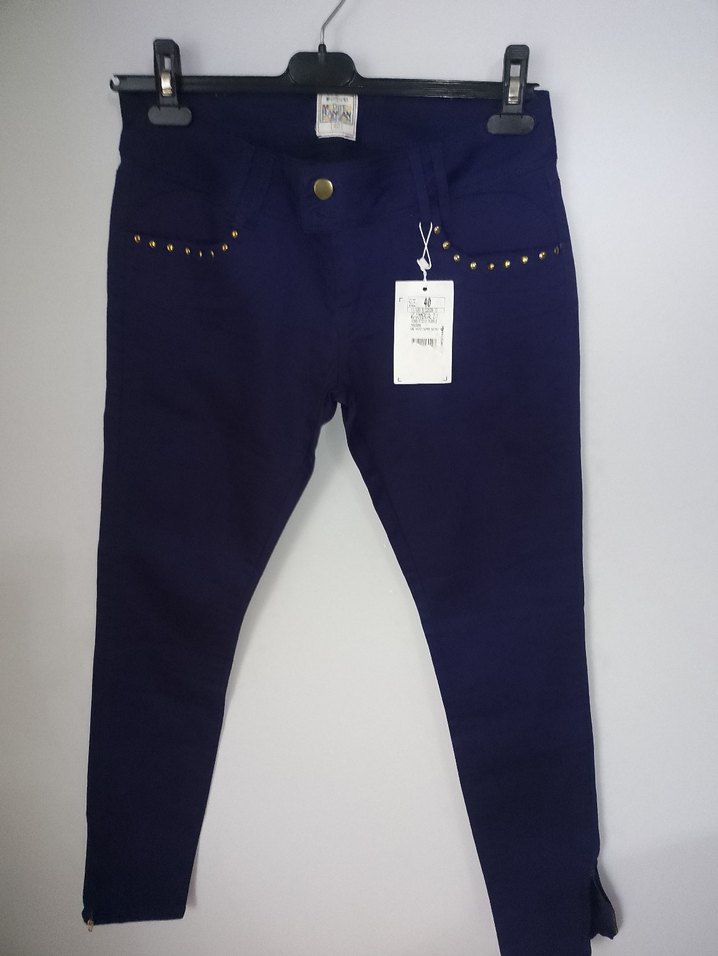 Bayanlar için düğmeli, parlak lacivert denim pantolon. Sokak stiline uygun, baskılı ve dar kesim tasarım.