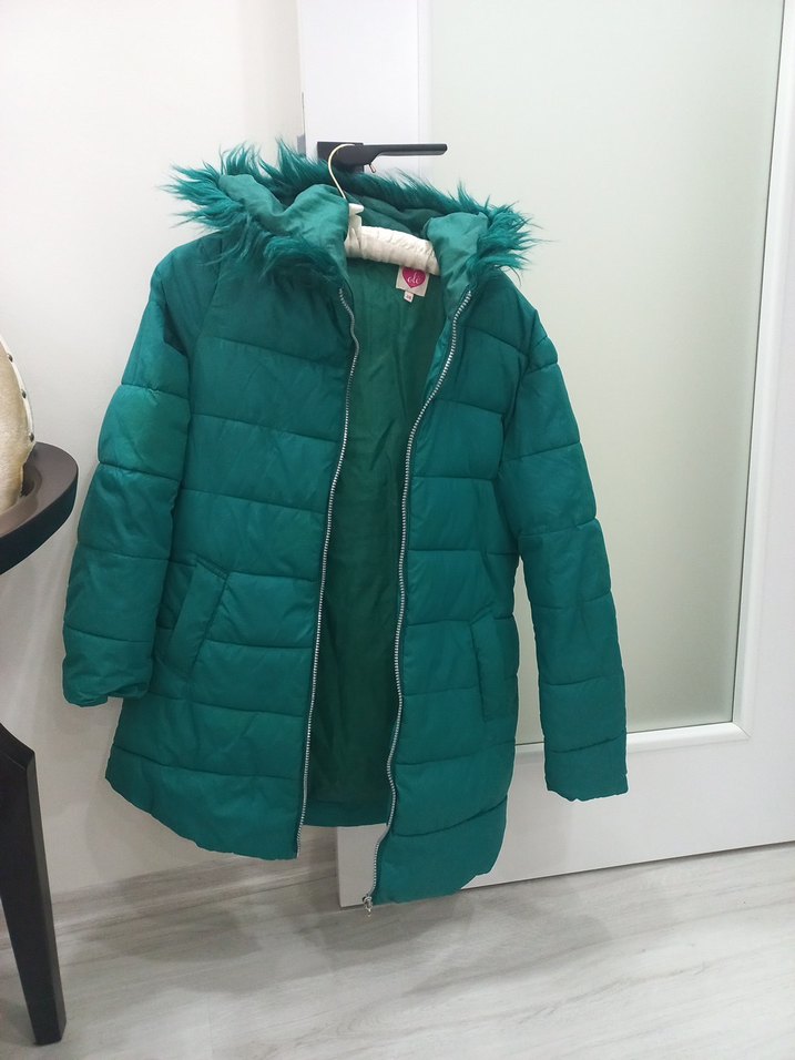 Parlak yeşil renkli, kürklü detaylara sahip, yumuşak ve sıcak dokulu bayan montu. Notched lapel yakalı ve fit kesim, sokak modasına uygun.