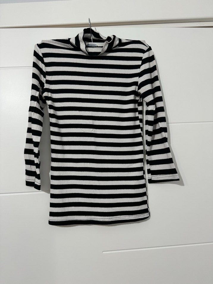 Bayan tişörtü, uzun kollu ve yüksek yakalıdır. Pamuklu kumaştan yapılmış, siyah ve gri çizgili, pileli ve dar kesimlidir.