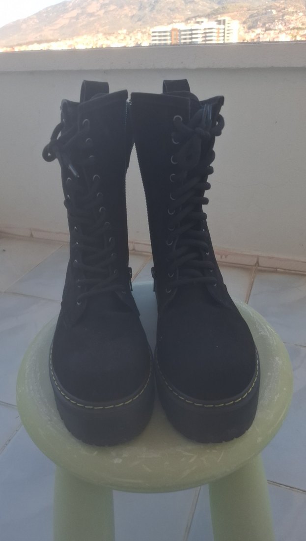 Siyah Süet Malzemeden, Platform Topuklu ( topuk kısmıda dahil komple kalın taban ) ve Bağcıklı Tarzdadır Kullanıma Rahattır 37 Numaradır Sayılı Kullanılmıştır ( 4 5 kez anca giyildi )