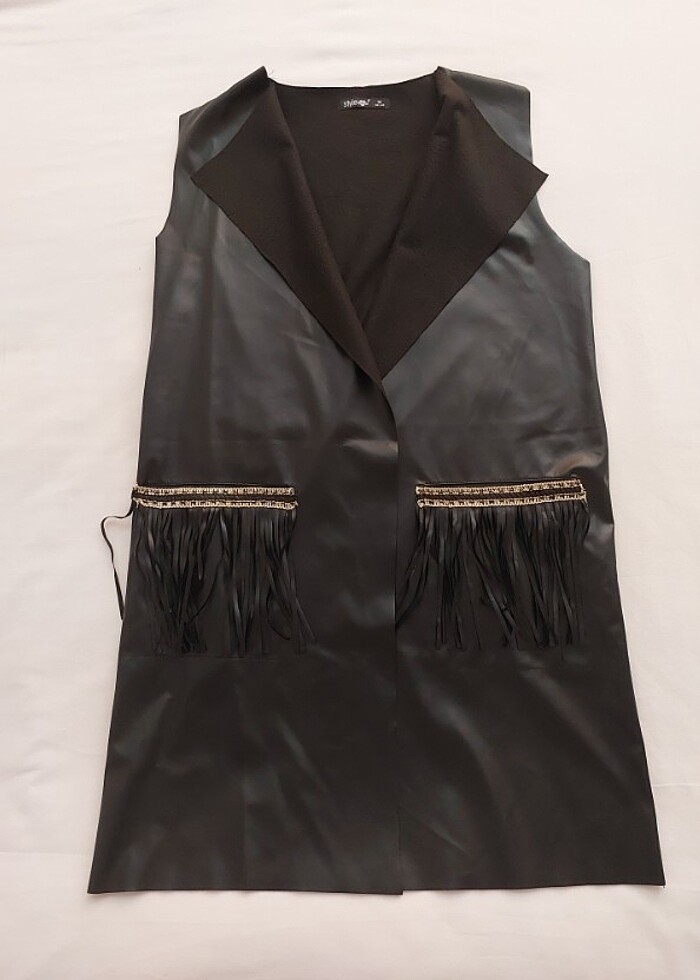 Az kullanıldı suni deri cep detayları püsküllü yelek