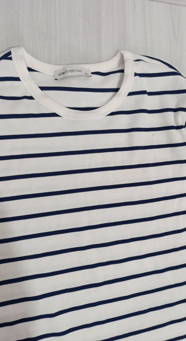 günlük giyime uygun rahat kalıbıyla yüzde yüz pamuklu fittilli kumaş beyaz lacivert çizgili bayan tişört lcwakiki marka