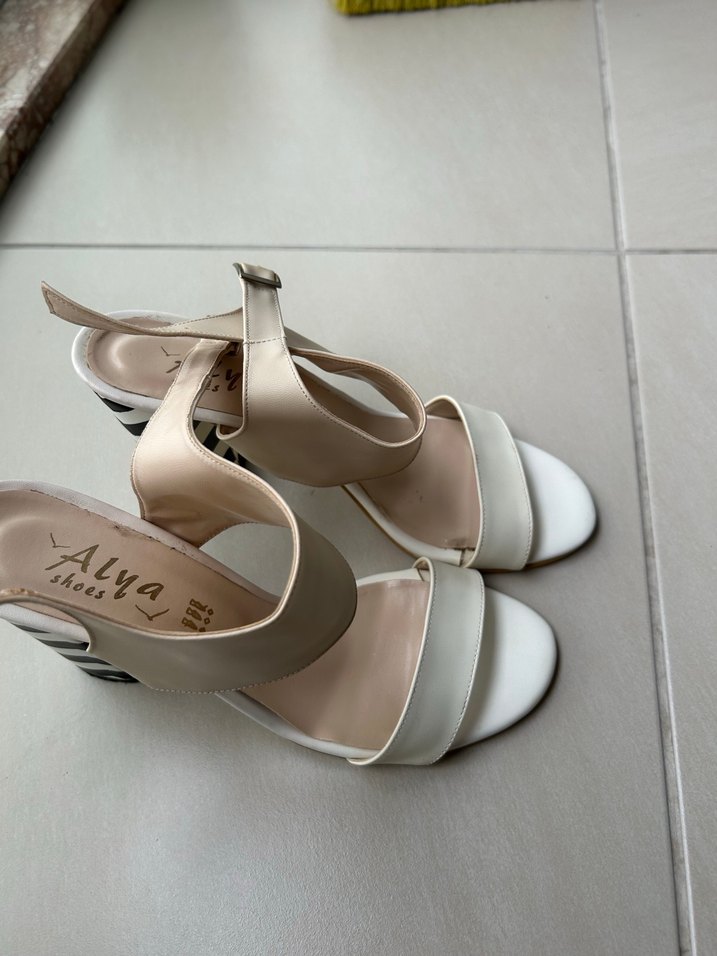 Krem rengı topuklu. 10 cm topugu vardır. 40 numara ama 39 tam oluyor