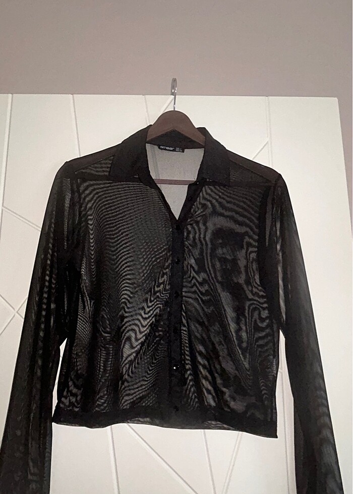 Bayan tranparan bluz, hiç giyilmemiş, etiketi mevcut değil, önü düğmeli fakat komple dikili açılmıyor, L beden, iki kol arası 43 cm daha fazla da olabiliyor esnek olduğu için, uzunluğu 50cm