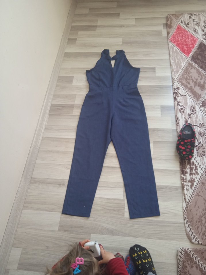 Lacivert kumaştan, V yakalı, kolsuz uzun tulum. Rahat kalıbı ve günlük kullanıma uygun stili ile dikkat çeker. iki kol arası 45 bel 38 basen 48 boy 138