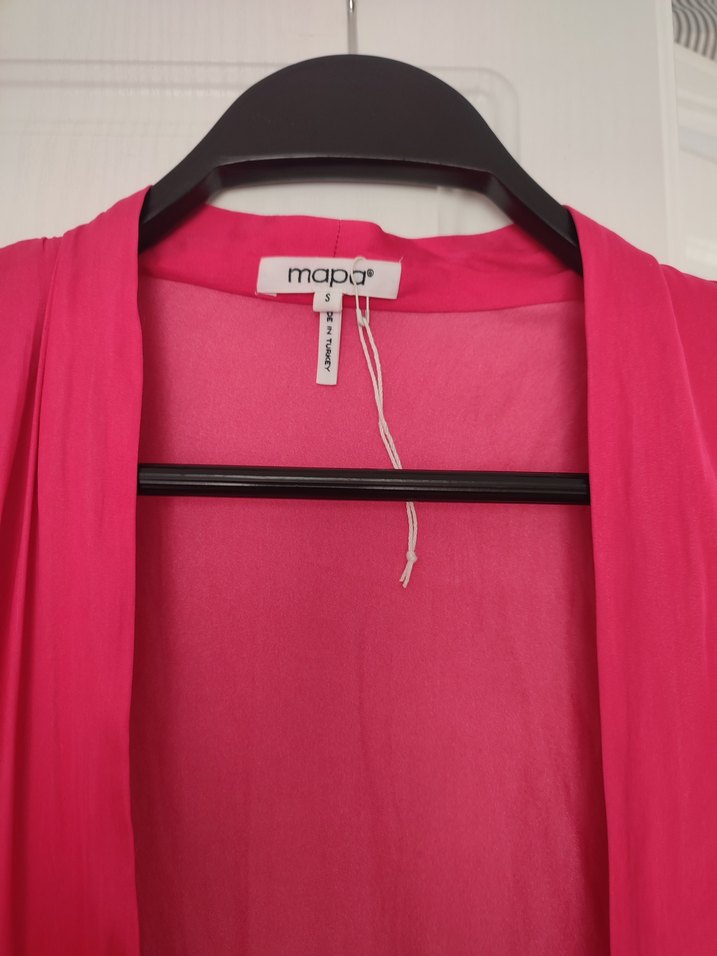 Pembe, parlak baskılı kumaştan, uzun ve kolluksuz, bol kesim kadın sabahlık. Minimalist tarz için uygun, üzerinde 'mapa' etiketi bulunur.