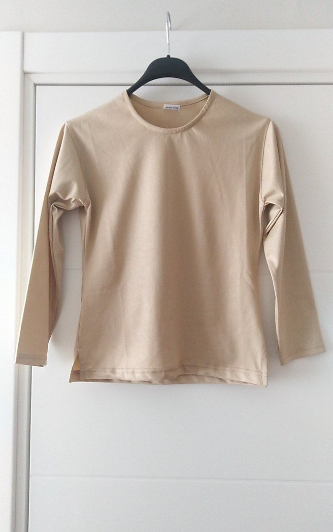 Uzun kollu, yuvarlak yakalı, süet kumaştan yapılmış bej renkli, rahat kesim basic badi.