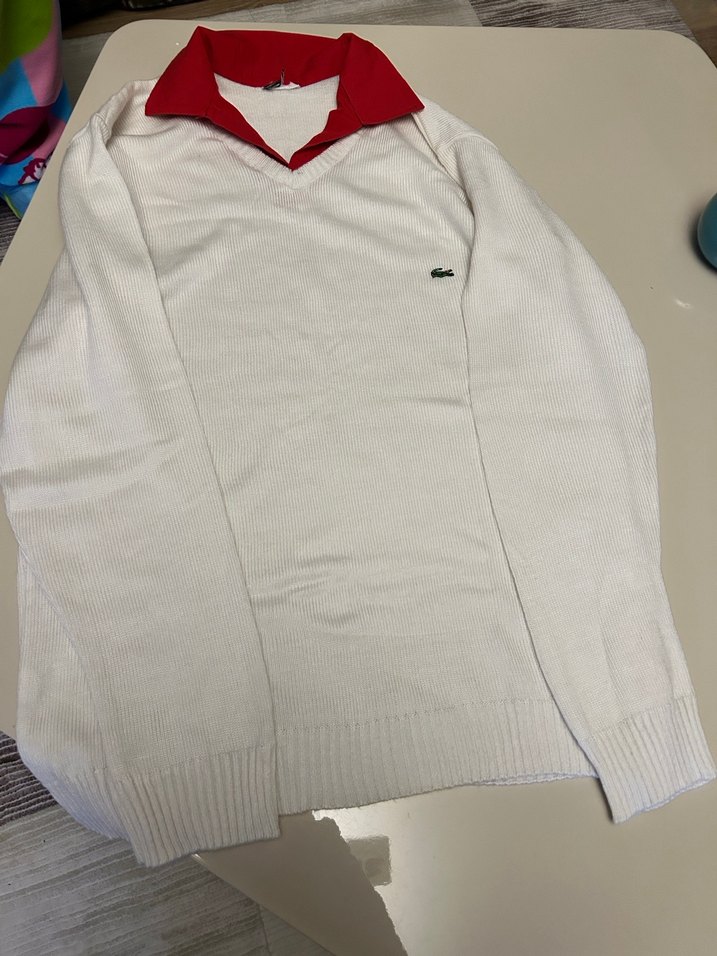 Kırmızı yakası olan beyaz pamuklu, uzun kollu, rahat kesim kazak, gündelik sokak tarzı için uygundur.