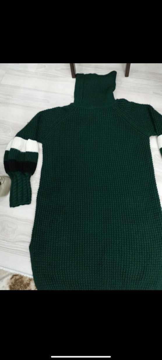 Koyu yeşil örgü triko elbise, boğazlı ve uzun kolludur. Fitted kesimiyle rahat ve şık bir sokak stili sunar. Kollarında beyaz ve siyah şerit detayları bulunur.