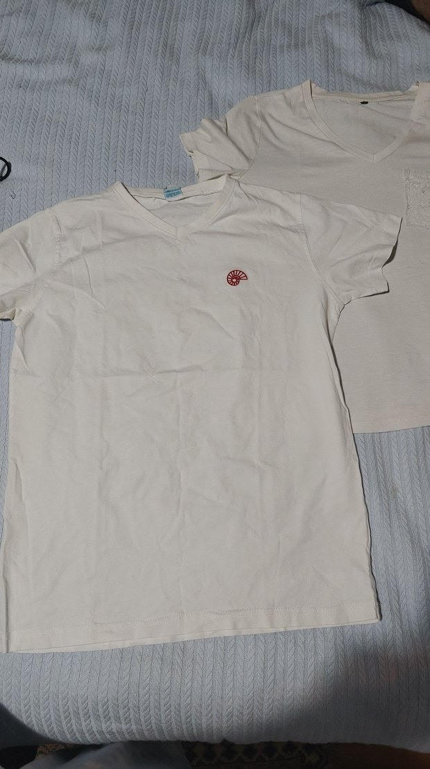 bayan tişörtü kısa kollu, V yakalı ve dar kesimlidir. Yumuşak pamuktan üretilmiş, sade beyaz renkte ve küçük kırmızı bir ambleme sahiptir.