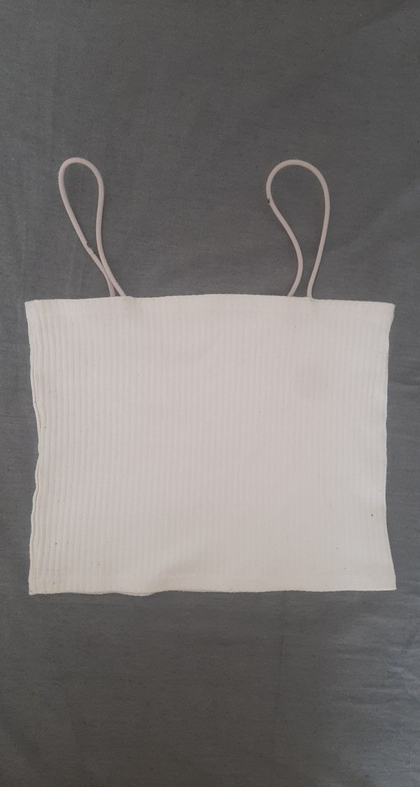 İnce askılı ve straplez yakalı, bej renkli, yumuşak sentetik kumaştan yapılmış, düz ve minimal tasarımlı kadın crop top. Günlük sokak stili için uygundur.