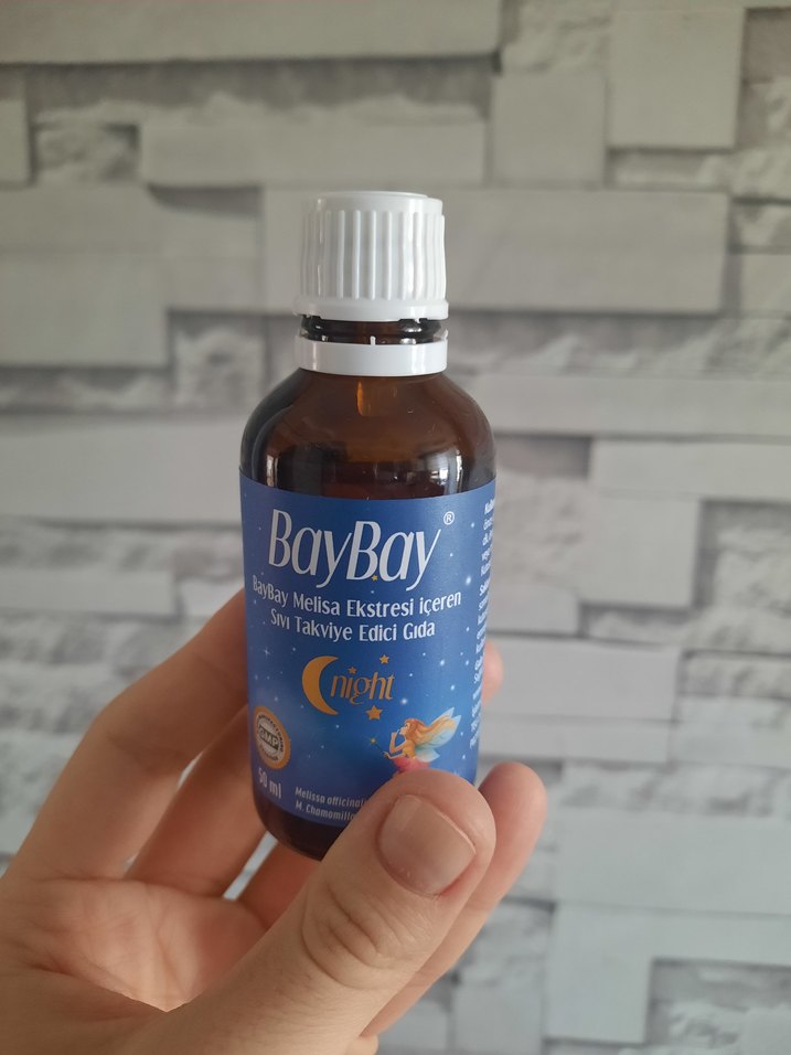BayBay Night melisa ekstresi içeren takviye sıvı, bebeklerin gece rahatlamasına destek olur. 50 ml şişede, açık mavi etiketli. Sadece 30 damla kullandık. Artık ihtiyacımız yok eczaneden aldık.