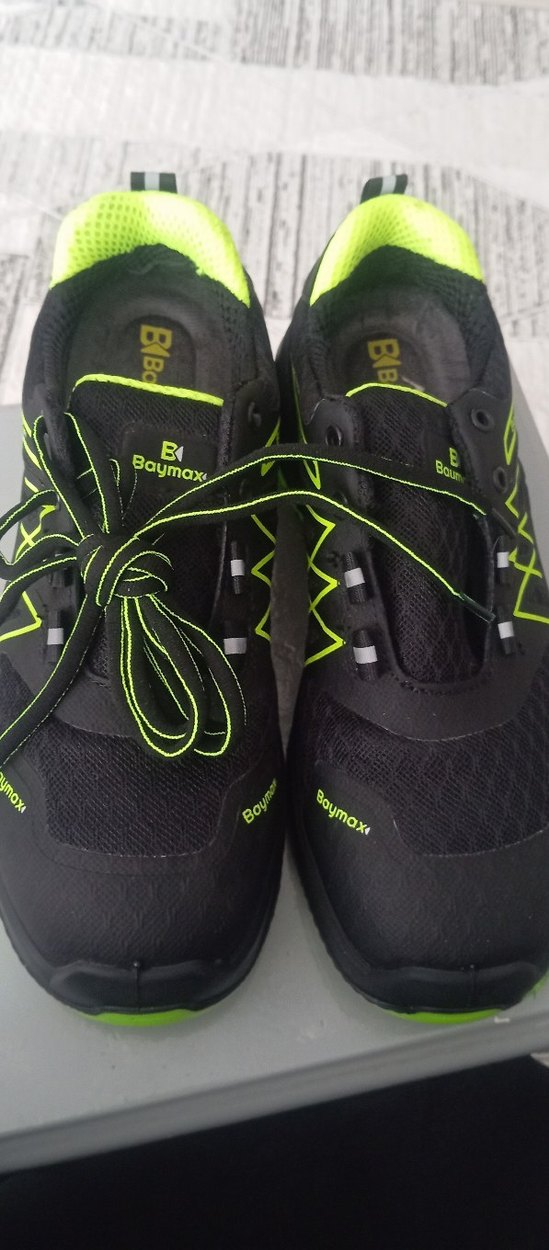 Baymax marka, siyah ve renkli desenli, bağcıklı spor ayakkabılar. Dayanıklı kauçuk malzemeden çelik iş ayakkabısı
