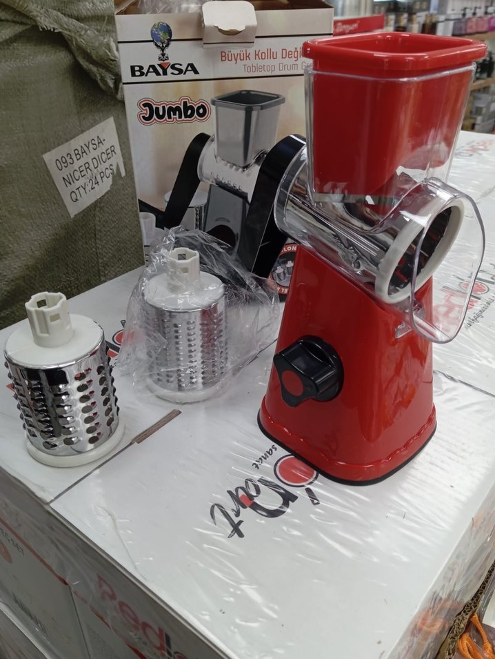 BaySA Jumbo renkli sebze doğrayıcı, farklı tamburlar ile dilimleme ve rendeleme yapar. Masaüstü kullanım için uygun, kontrol düğmelidir.