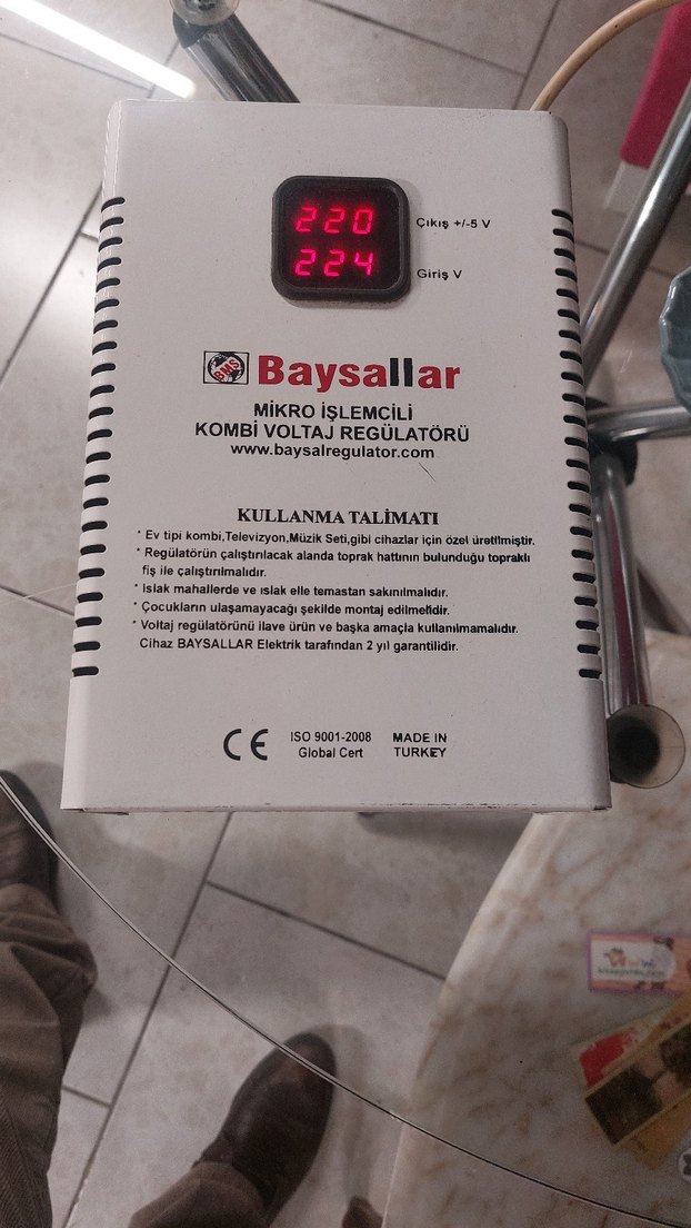 Baysallar mikro işlemcili kombi voltaj regülatörü, cihazlar için stabil voltaj sağlar. Dijital ekran giriş ve çıkış voltajını gösterir. Türkiye'de üretilmiştir. ⚡