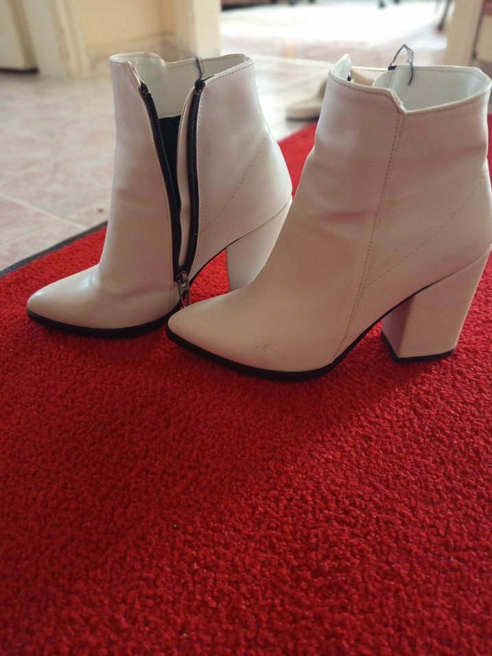 Beyaz deri, stiletto topuklu ve yan fermuarlı kadın botu. Minimalist ve çağdaş tasarıma sahip, günlük kullanıma uygun şık bir model.