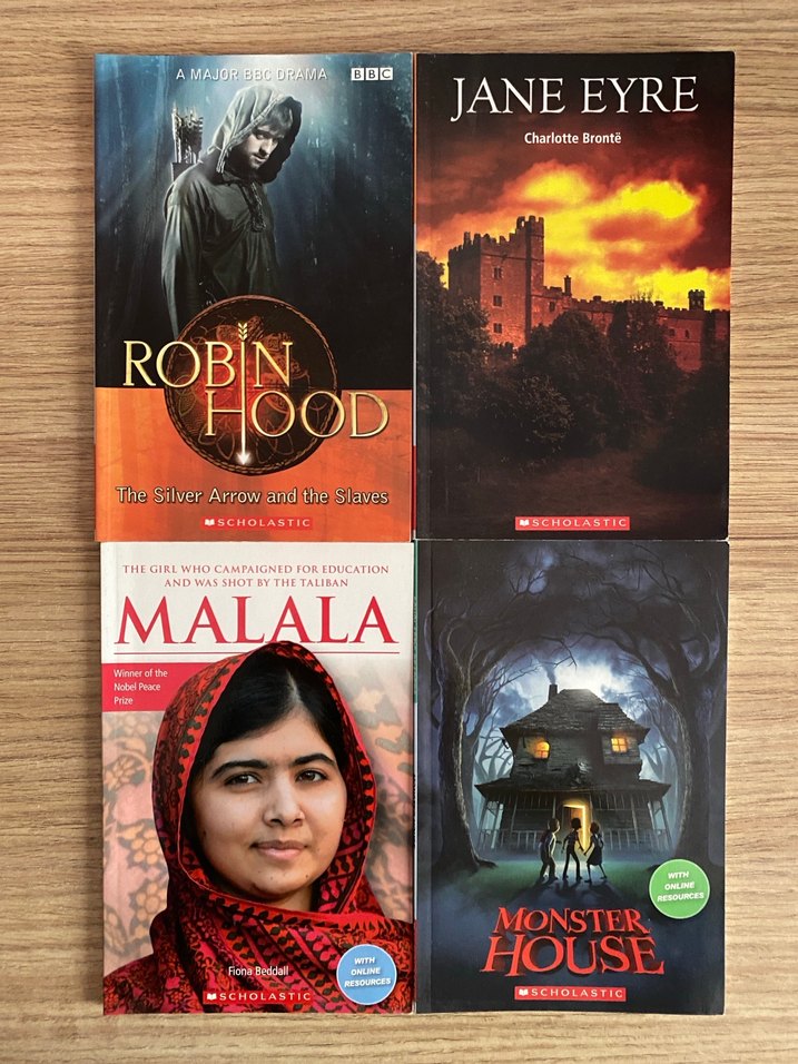 Robin Hood, Jane Eyre, Malala ve Monster House kitaplarından oluşan set, farklı hikayeler sunar. İngilizcemi geliştirmemde bu kitapların oldukça yardımı olmuştu. Bilmediğim kelimeleri işaretleyip türkçe anlamlarını yazmıştım bu nedenle fiyatı uygun tutuyorum. Ayrı ayrı satmayı düşünmüyorum, 4lü fiyattır.