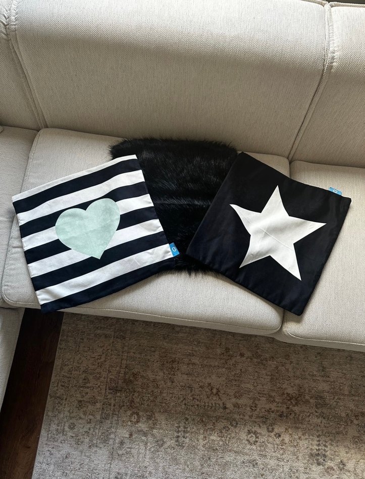 Çok az kullanıldı. Sorunsuzdur. İç dolguları dahil değildir. Yeşil kalp 42x42 Siyah peluş 41x41 Siyah yıldız 42x42 Üçlü takımdır ayrı ayrı satışı yoktur.