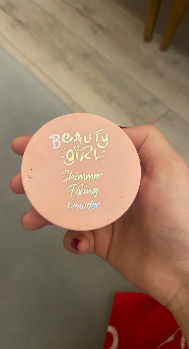 BCAUTY GIRL Işıltılı Sabitleyici Pudra, pastel pembe renkte, makyajı sabitleyip hafif bir parlaklık sağlar. Hafif yapılıdır.