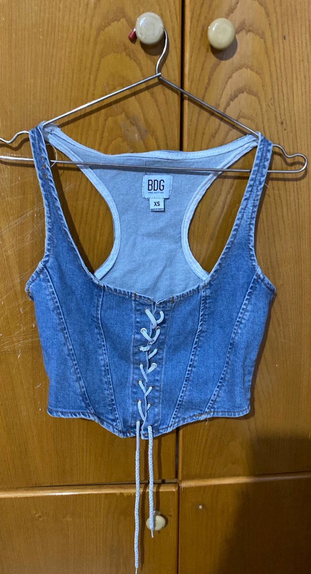 BDG markalı, mavi pastel tonlarında, bağcıklı ve kolsuz denim büstiyer. Halter yaka ve sıkı kesimiyle sokak stiline uygun.