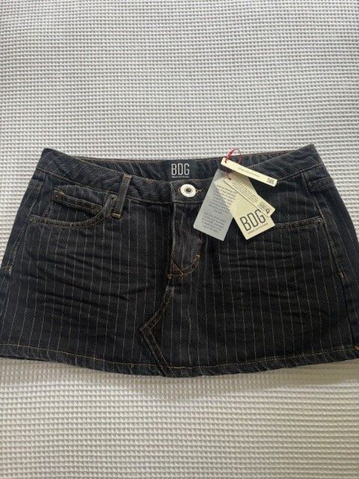 BDG markalı, düğmeli ve çizgili desenli siyah mini kot etek. Trendy casual tarz için uygun, romantik akşamlar için ideal. ve bedeni XXS