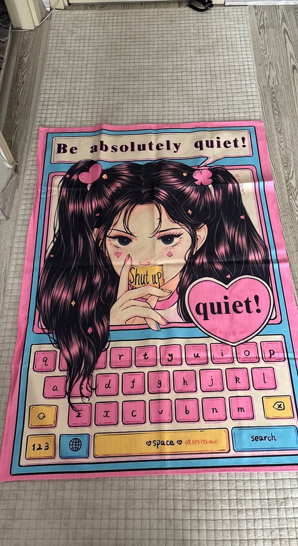 Canlı renklerde, çizgi roman tarzında kız figürlü ve 'Shut up!' yazılı kart tutan, klavye desenli halı. Üzerinde 'Be absolutely quiet!' ve 'quiet!' yazıları var.